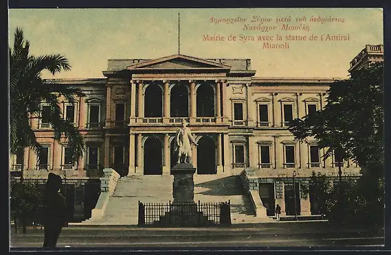 AK Syra, Mairie avec la statue de l`Amiral Miaooli