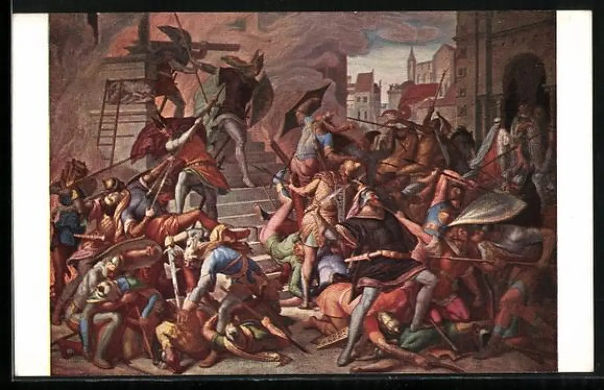 AK Szene Kampf auf der Stiege in Etzels Palast aus den Nibelungen