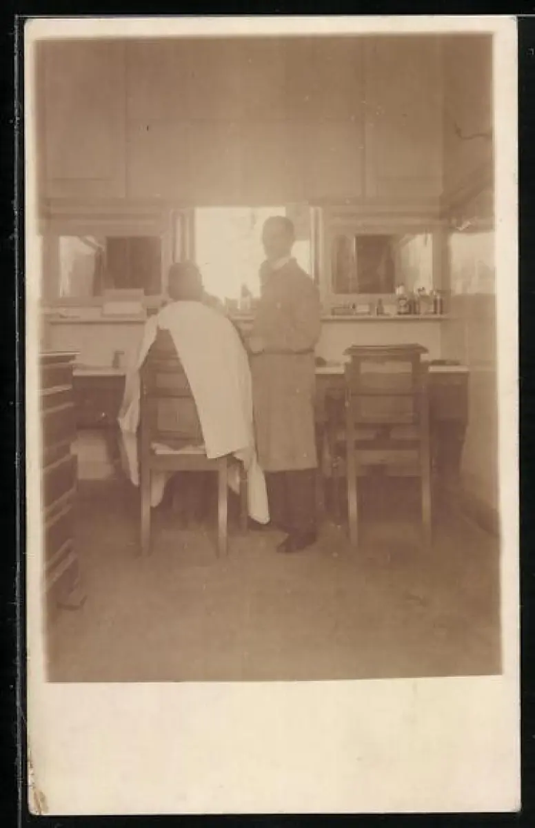 AK Szene beim Friseur, Mann im Friseur Sessel