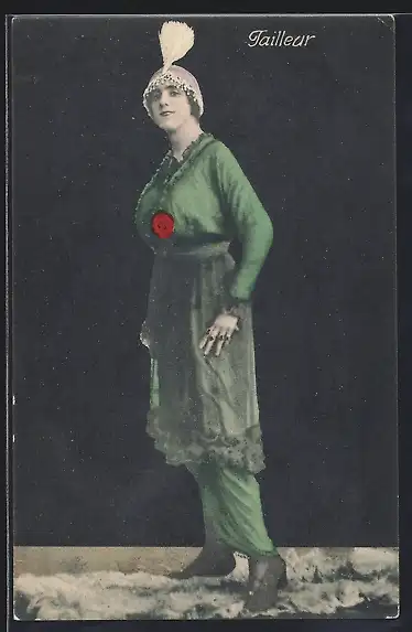 AK Tailleur, Mann verkleidet als Frau in grünem Kleid