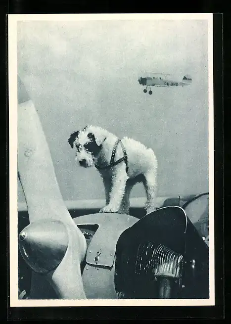 AK Talisman, Hund auf Propeller, Im Hintergrund Flugzeug in der der Luft