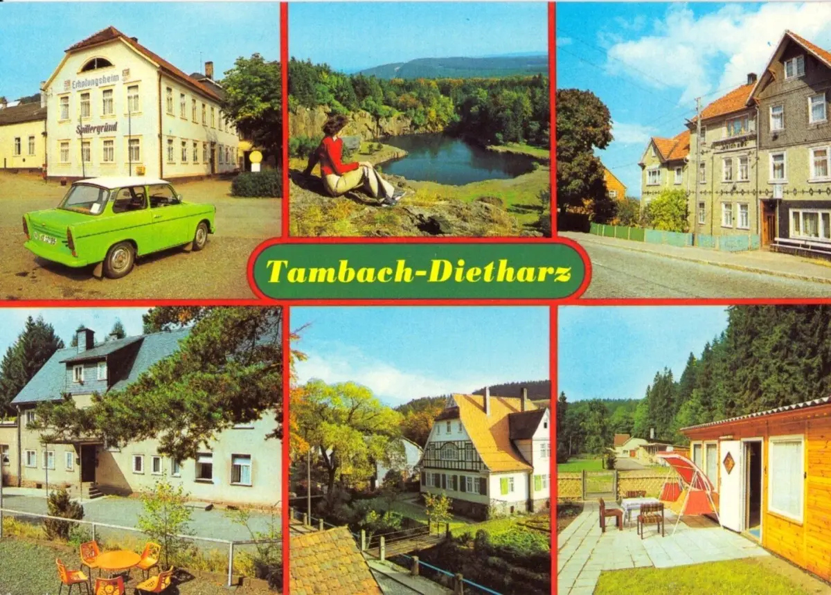 Ansichtskarte Tambach-Dietharz Kr. Gotha sechs Abb. - FDGB-Heim "Splittergrund", Am Kratersee, "Waldhaus", HOG "Waldbaude", Schmalwassergrund, Ferienheim des VEB Kraftverkehr Mühlhausen Erhaltung I-II ungelaufen Druckvermerk: 1987 Herstellungsland: DDR Verlag: Bild und Heimat, Reichenbach (Vogtl) - 01 09 0244/05