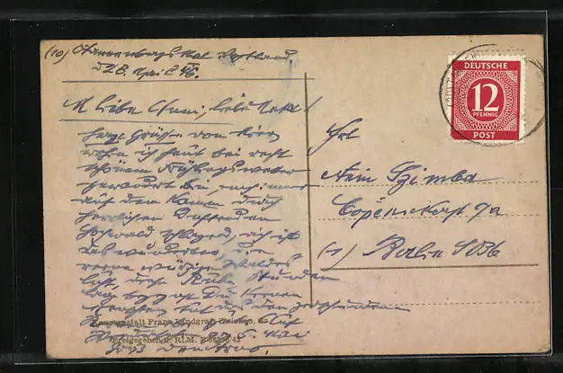Personenbezogene Daten auf der Rückseite der Karte wurden durch blauen Textmarker unkenntlich gemacht. Die blauen Stellen sind auf die Vorderseite durchgeweicht und wirken sich negativ auf das Postkartenfoto aus