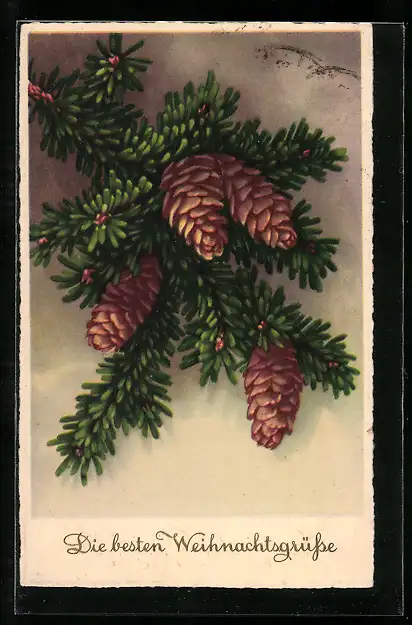 AK Tannenzweig mit Zapfen zu Weihnachten