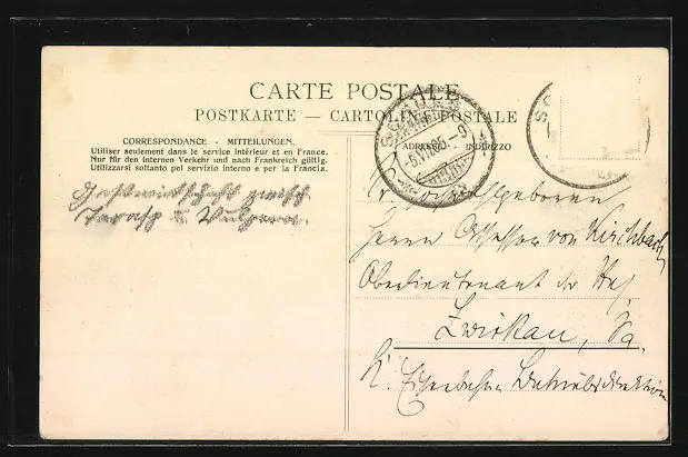 alte Ansichtskarte, gelaufen 1905, Briefmarke entfernt, rückseitig Oberflächenschaden, guter Zustand