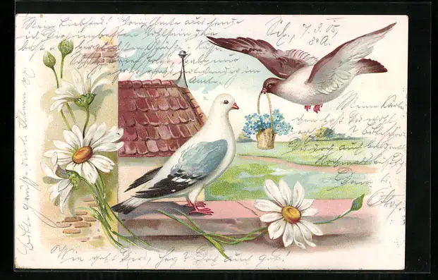 AK Taubenpaar mit Blumenkörbchen, Margeriten