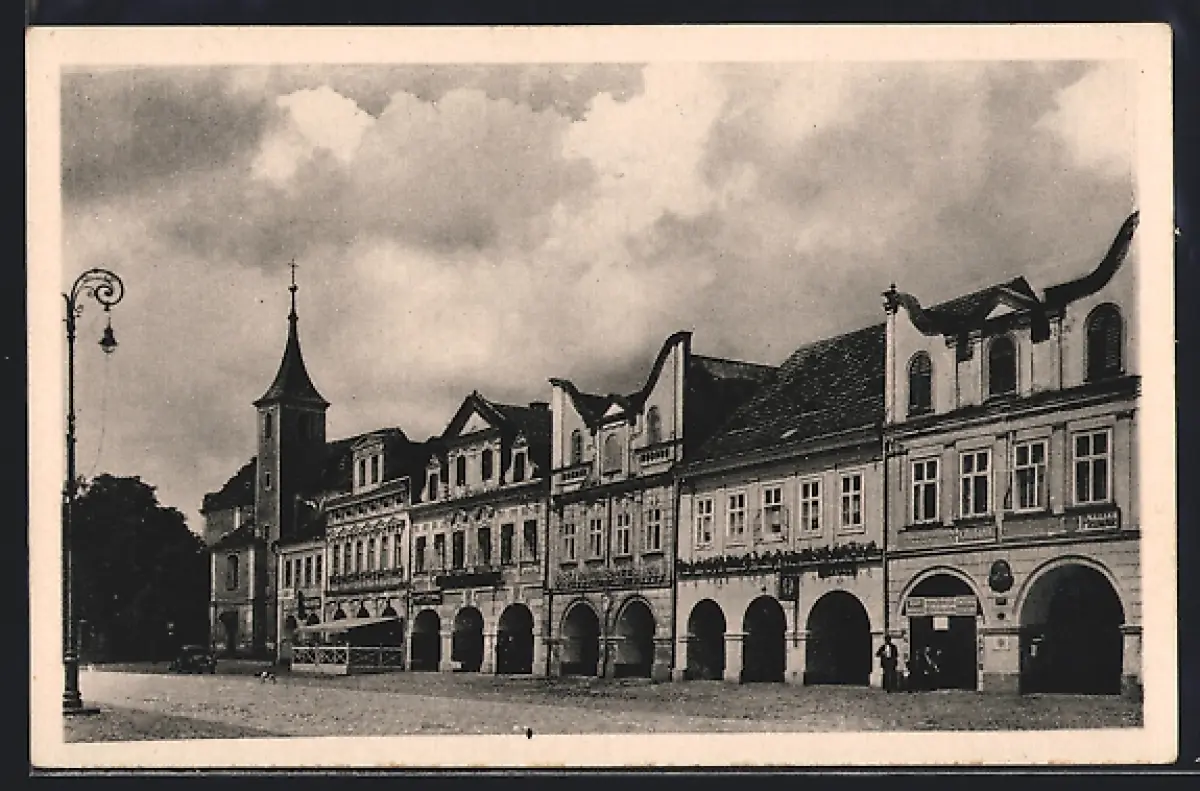 AK Taus, Häuserpanorama mit Kirche, Arkaden