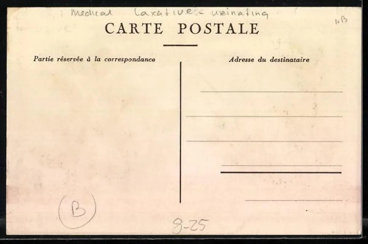 Personenbezogene Daten auf der Rückseite der Karte wurden durch blauen Textmarker unkenntlich gemacht. Die blauen Stellen sind auf die Vorderseite durchgeweicht und wirken sich negativ auf das Postkartenfoto aus