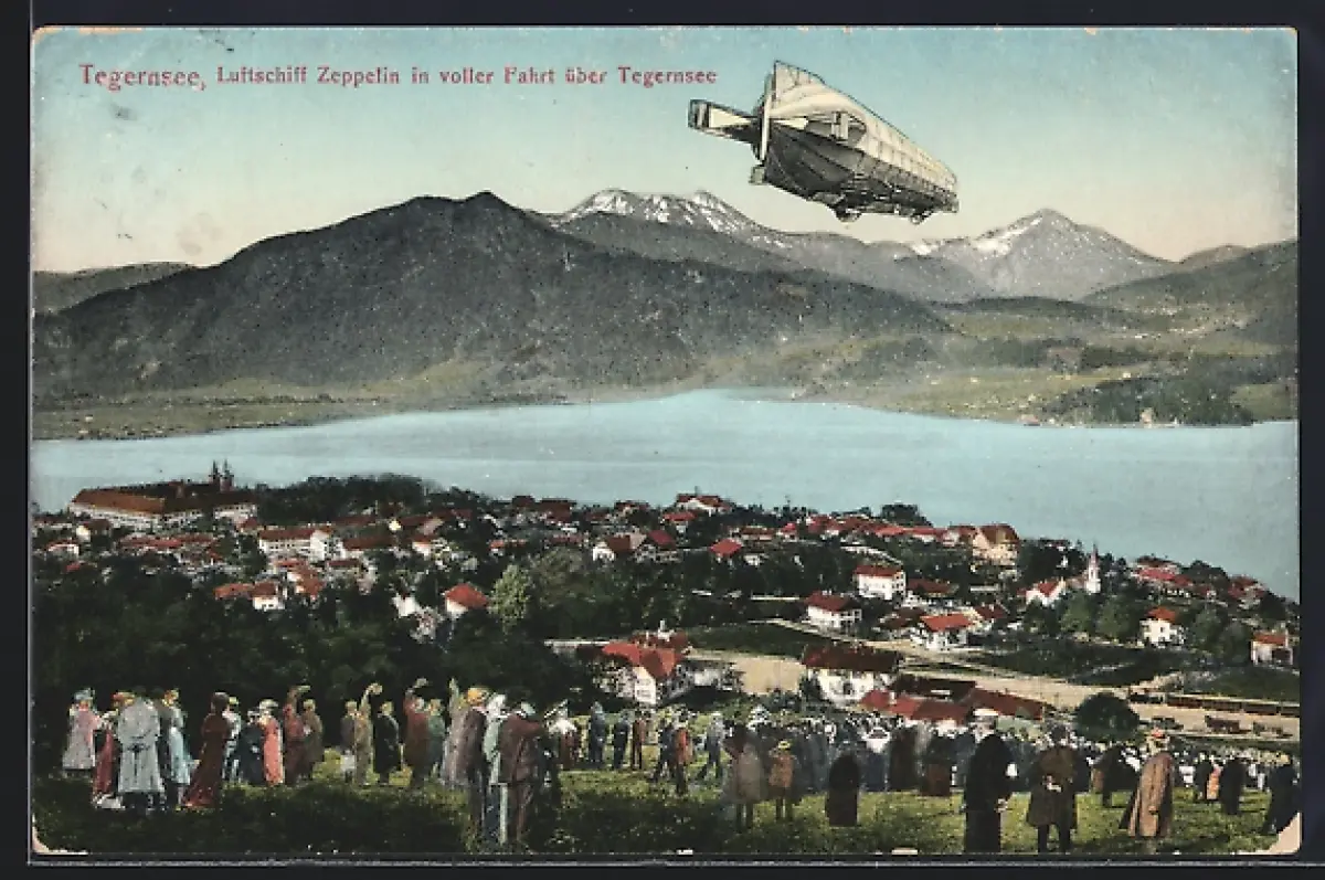 AK Tegernsee, Luftschiff Zeppelin in voller Fahrt über den Ort