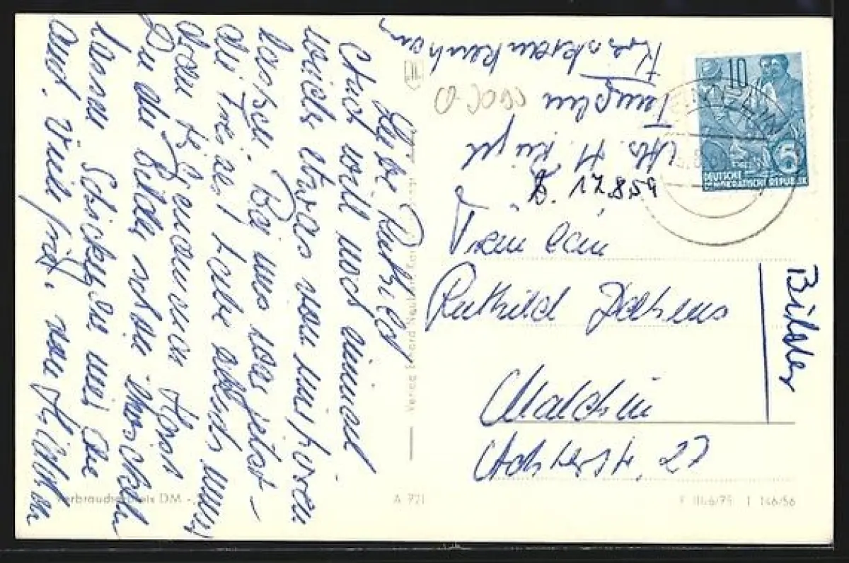 Personenbezogene Daten auf der Rückseite der Karte wurden durch blauen Textmarker unkenntlich gemacht. Die blauen Stellen sind auf die Vorderseite durchgeweicht und wirken sich negativ auf das Postkartenfoto aus