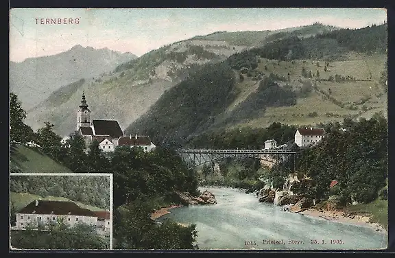 AK Ternberg, Brücke über den reissenden Fluss, Blick zur Kirche