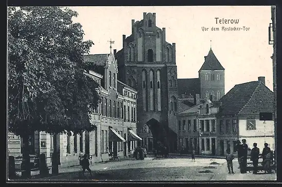 AK Teterow, Strassenpartie vor dem Rostocker Tor, mit Geschäften