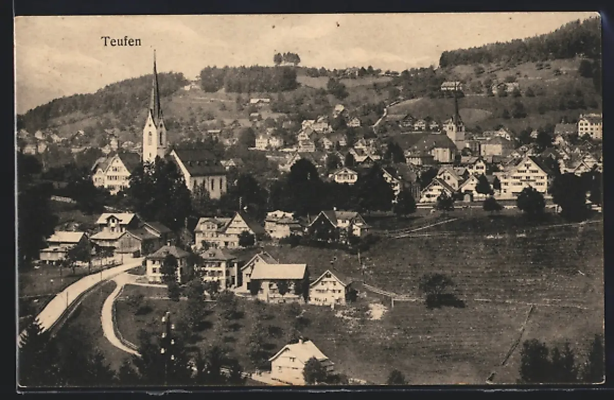 AK Teufen, Totalansicht mit Kirche aus der Vogelschau