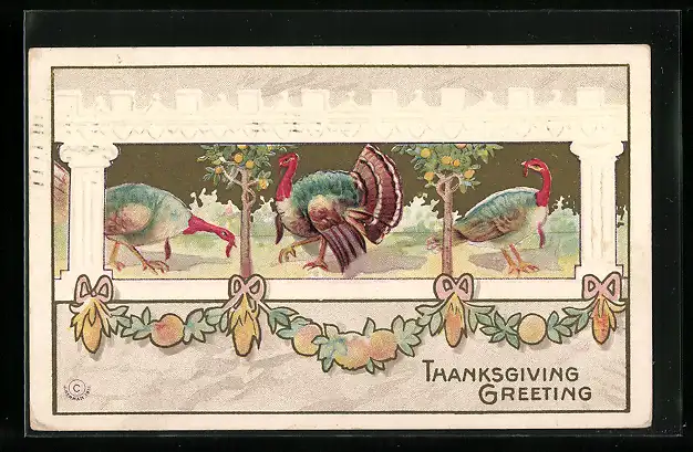 AK Thanksgiving Greeting, Truthähne unter Obstbäumen