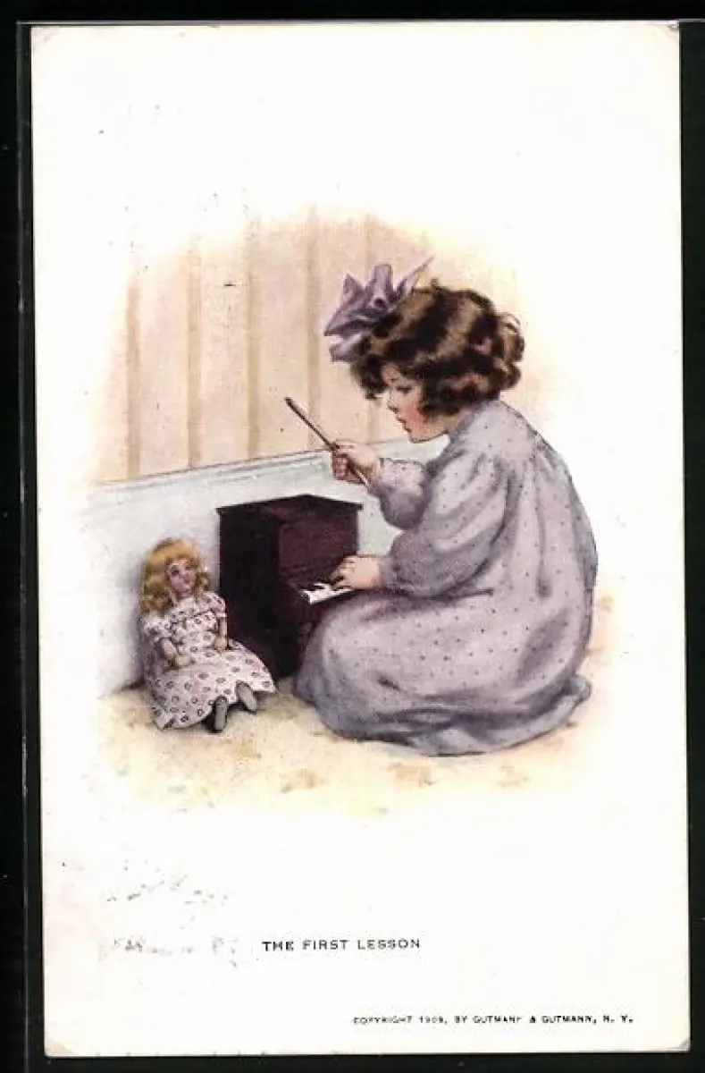 AK The first lesson, Mädchen spielt für ihre Puppe auf dem Klavier
