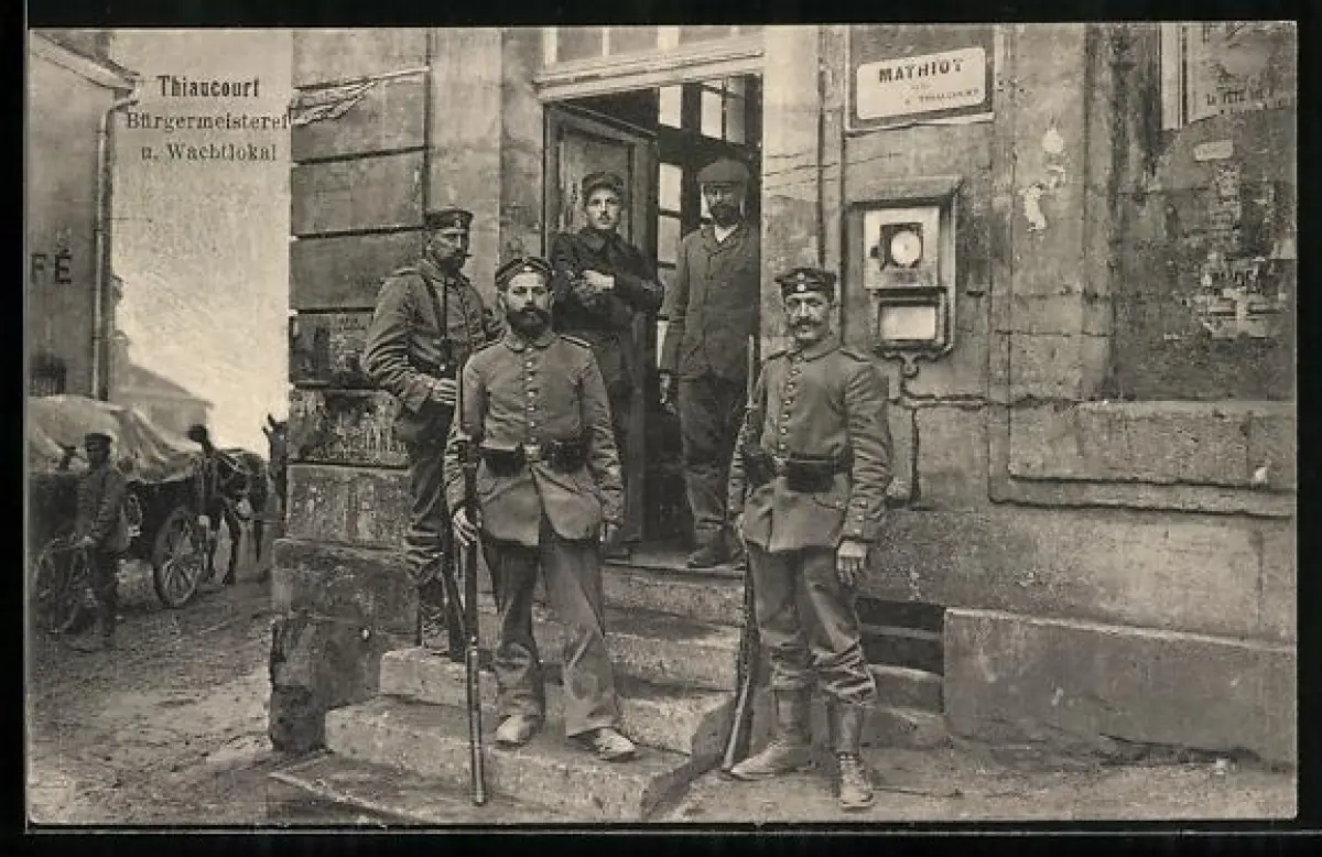AK Thiaucourt, Bürgermeisterei und Wachtlokal, eine Gruppe Soldaten