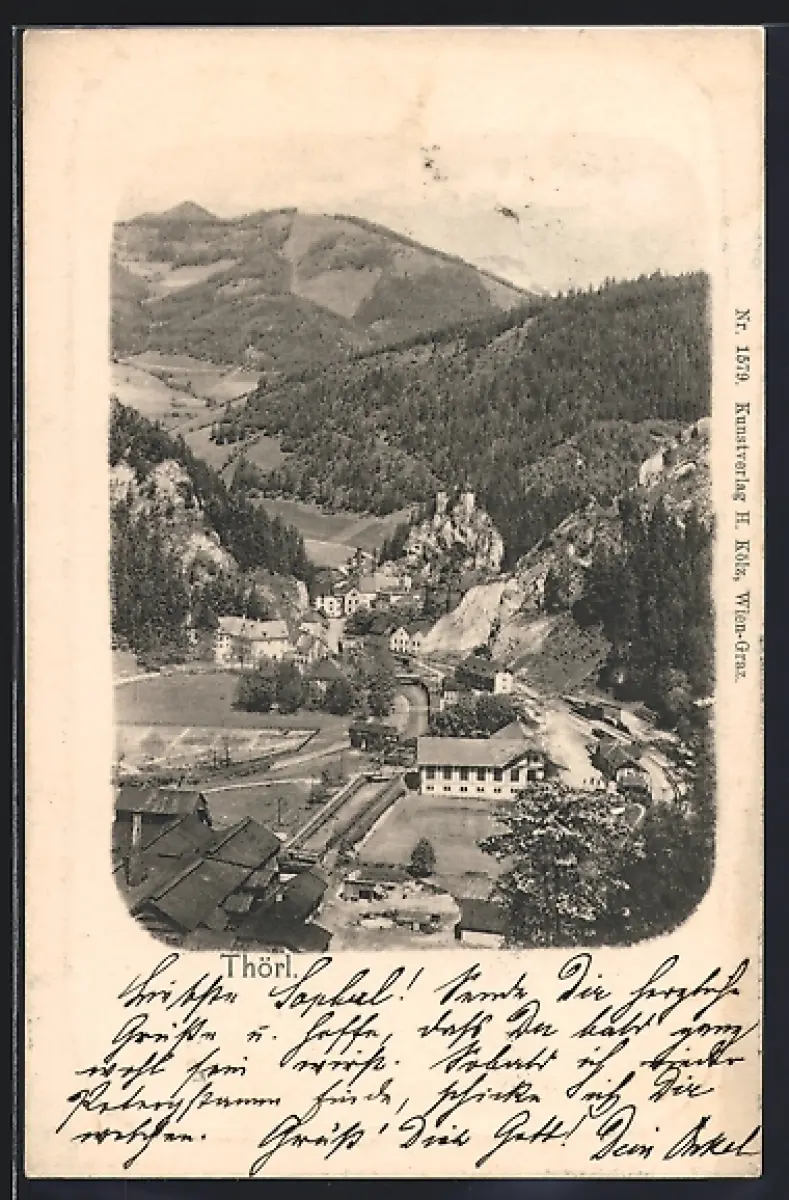 AK Thörl /Stmk., Totalansicht mit Burg und Bergpanorama aus der Vogelschau