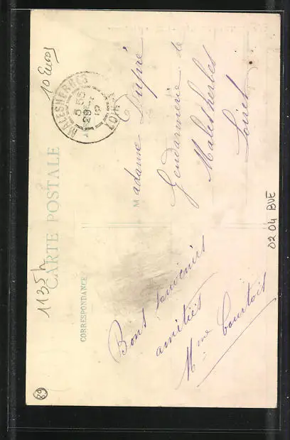 Personenbezogene Daten auf der Rückseite der Karte wurden durch blauen Textmarker unkenntlich gemacht. Die blauen Stellen sind auf die Vorderseite durchgeweicht und wirken sich negativ auf das Postkartenfoto aus