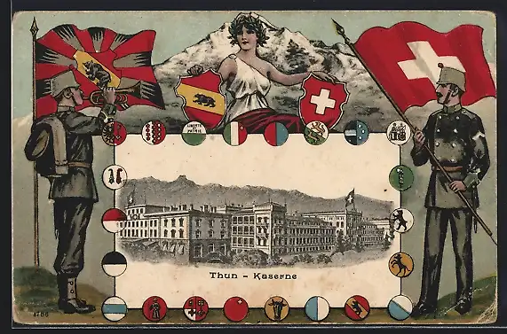 AK Thun, Kaserne, Passepartout mit Soldaten und Wappen