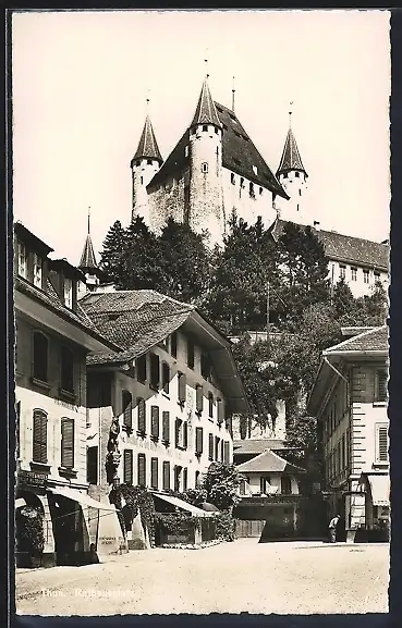AK Thun, Rathausplatz mit Gasthaus und Geschäft