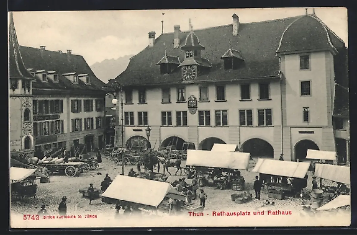 AK Thun, Rathausplatz und Rathaus mit Markt