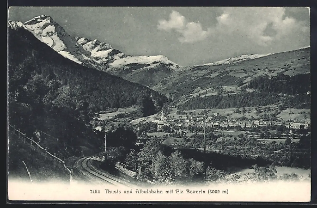 AK Thusis, Ortsansicht mit Albulabahn und Piz Beverin