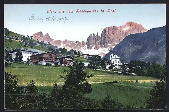 AK Tiers, Partie am Ortsrand mit Kirche und Rosengarten