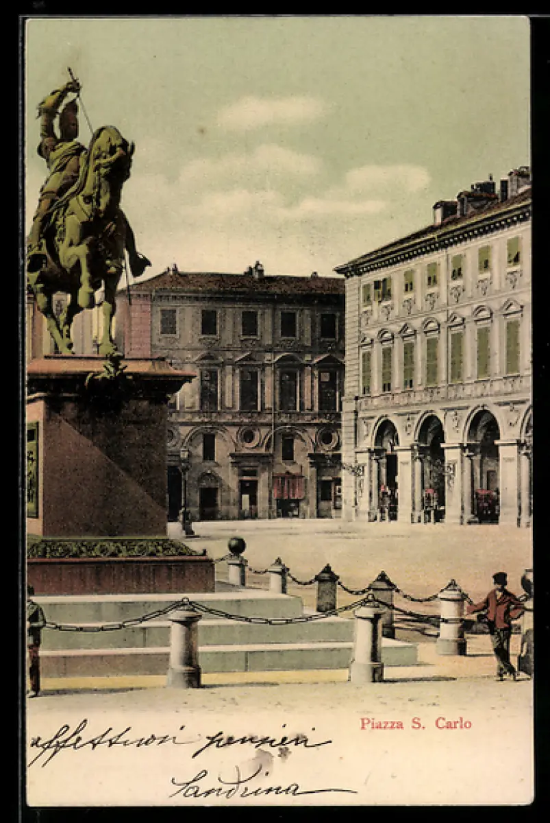 AK Torino, Piazza S. Carlo con statua e edifici storici