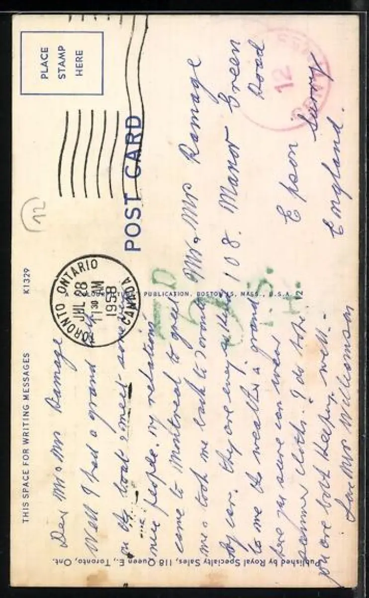 Personenbezogene Daten auf der Rückseite der Karte wurden durch blauen Textmarker unkenntlich gemacht. Die blauen Stellen sind auf die Vorderseite durchgeweicht und wirken sich negativ auf das Postkartenfoto aus
