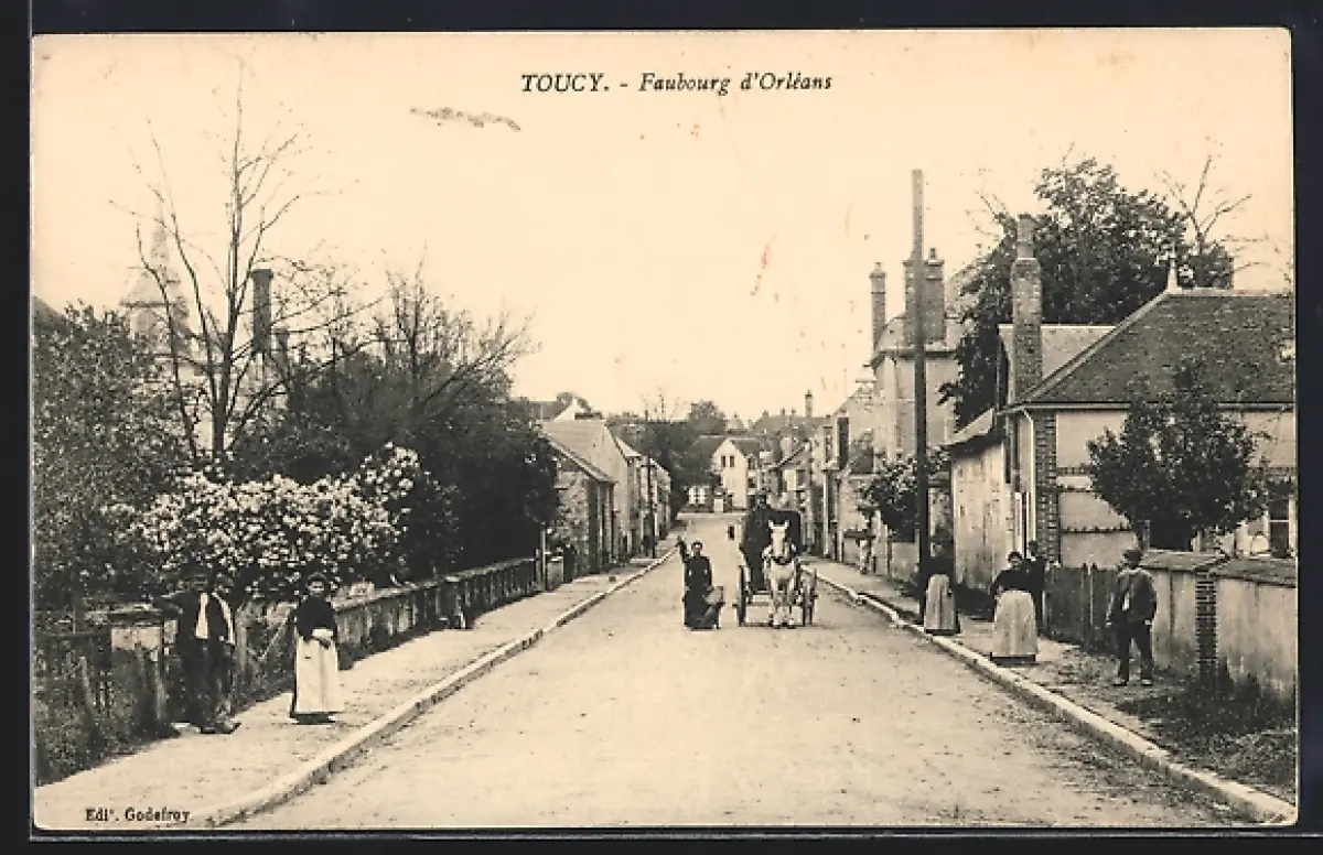 AK Toucy, Faubourg d`Orléans avec passants et calèche