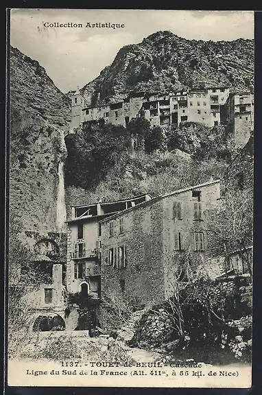 AK Touët-sur-Var, Vue du village pittoresque dans la montagne avec cascade majestueuse