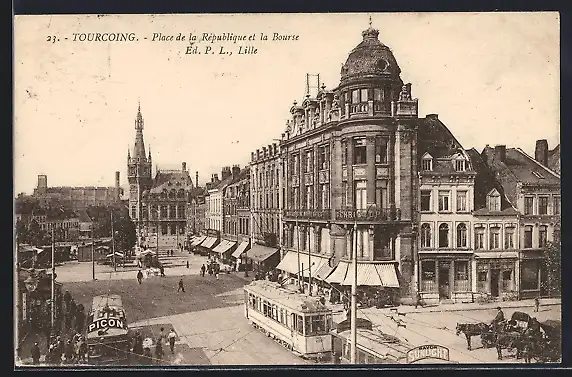 AK Tourcoing, Place de la Republique et la Bourse, Strassenbahn
