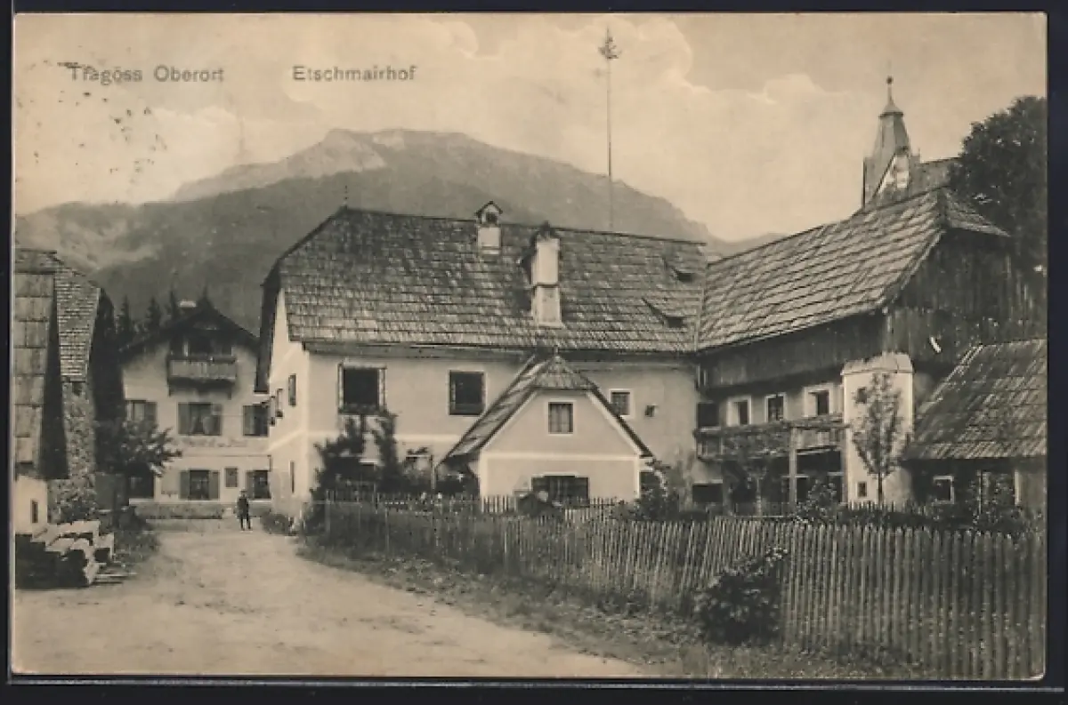 AK Tragöss, Strassenpartie mit Etschmairhof und Gasthof zur Post