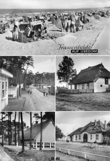 Ansichtskarte Trassenheide auf Usedom fünf Abb. - u.a. Ferienlager der "Friedrich-Schiller-Universität Jena und Bahnhof Erhaltung I-II postalisch gelaufen, gestempelt: unleserlich Druckvermerk: 1969 Herstellungsland: DDR Verlag: Heldge-Verlag KG, 437 Köthen - 9787