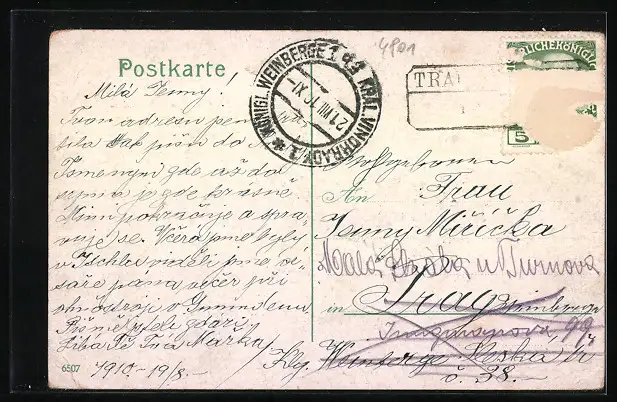 gelaufen, Briefmarke entfernt, rückseitig Oberflächenschaden, Stempelspur, Abriebspuren Ecken, Bugspur unten re., guter Zustand