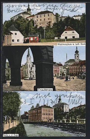 AK Trautenau, Marktplatz, Aupa-Partie, Mädchenschule mit kath. Kirche