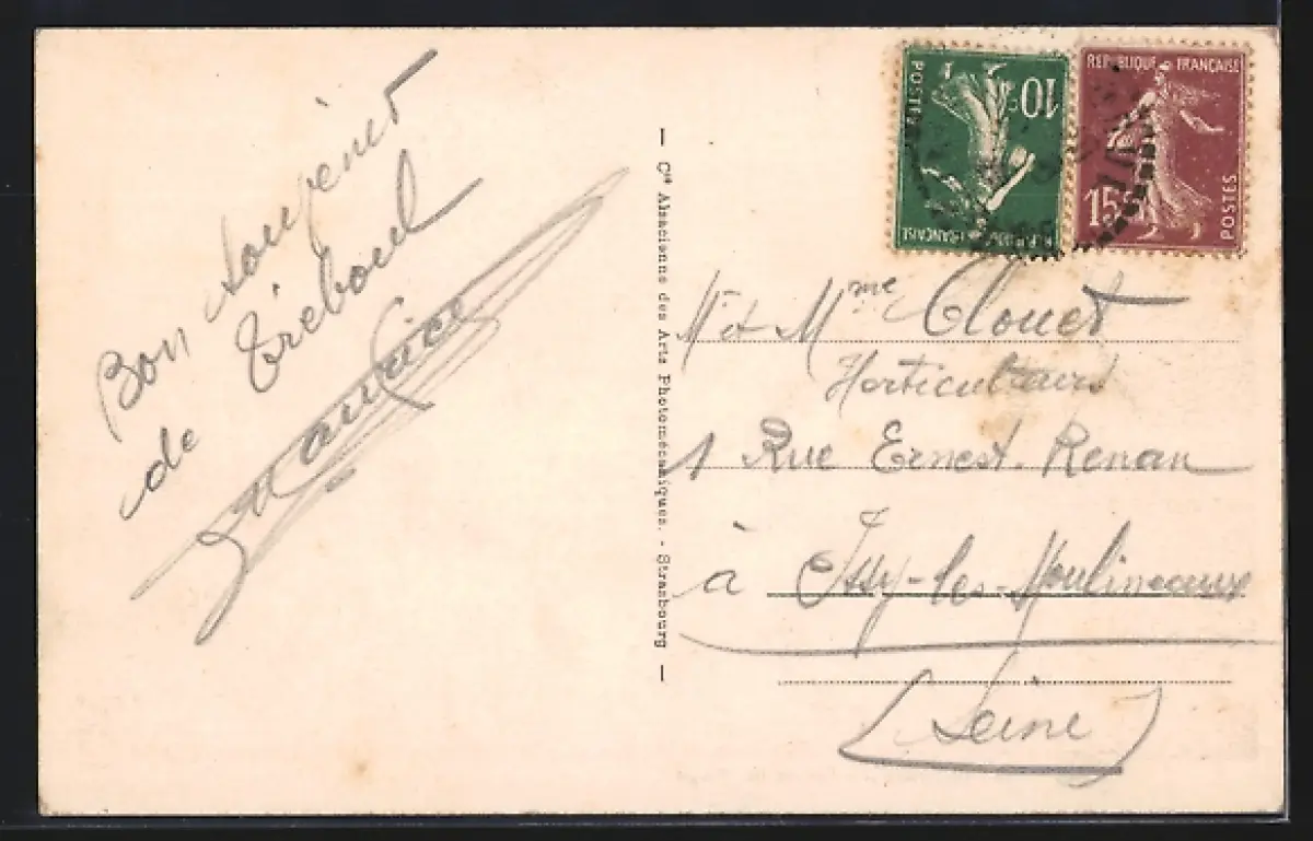 Personenbezogene Daten auf der Rückseite der Karte wurden durch blauen Textmarker unkenntlich gemacht. Die blauen Stellen sind auf die Vorderseite durchgeweicht und wirken sich negativ auf das Postkartenfoto aus