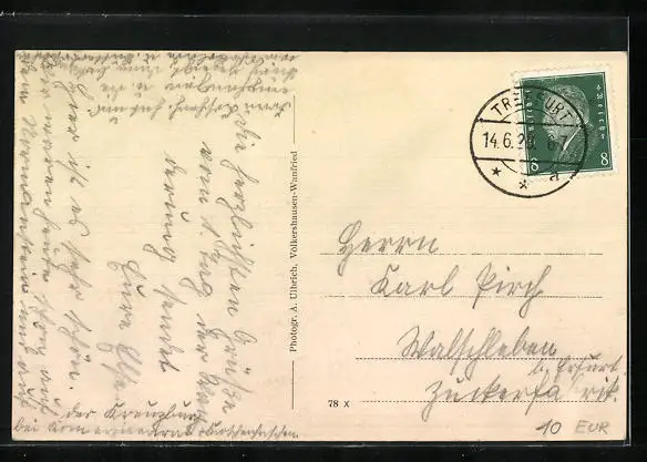Personenbezogene Daten auf der Rückseite der Karte wurden durch blauen Textmarker unkenntlich gemacht. Die blauen Stellen sind auf die Vorderseite durchgeweicht und wirken sich negativ auf das Postkartenfoto aus
