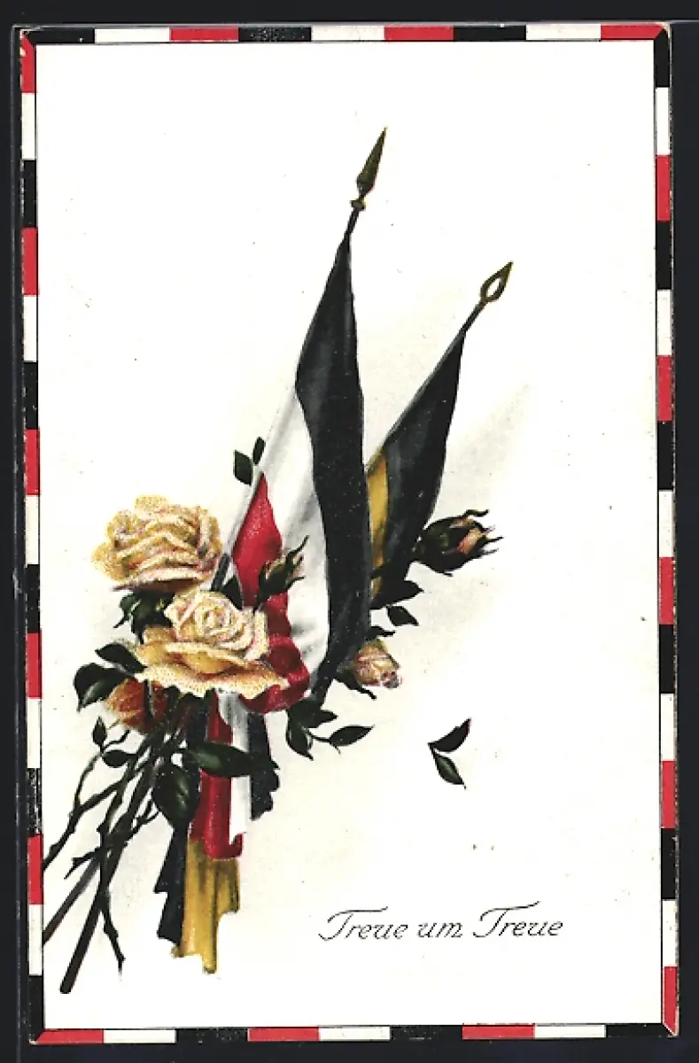 AK Treue um Treue, Deutsche Reichsfahne und Fahne von Österreich-Ungarn mit Rosen