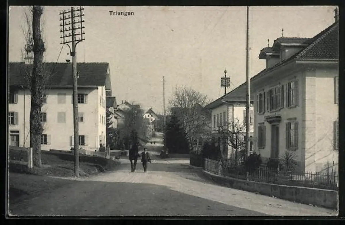 AK Triengen, Strassenpartie mit Wohnhäusern und Passant mit Pferd
