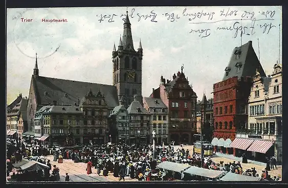 AK Trier, Hauptmarkt mit Rathaus und Strassenbahn