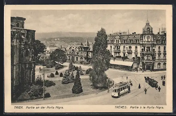 AK Trier, Partie an der Porta Negra mit Strassenbahn