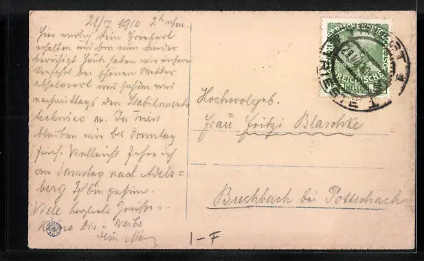 gelaufen 1910, Eckknick unten rechts, guter Zustand
