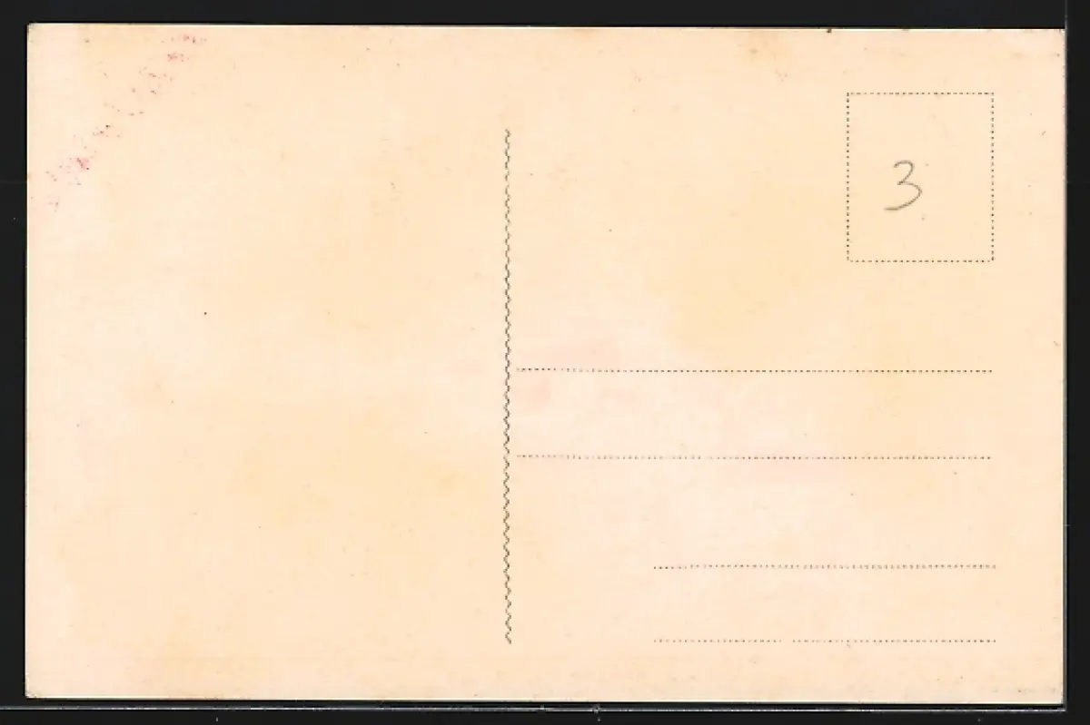 Personenbezogene Daten auf der Rückseite der Karte wurden durch blauen Textmarker unkenntlich gemacht. Die blauen Stellen sind auf die Vorderseite durchgeweicht und wirken sich negativ auf das Postkartenfoto aus