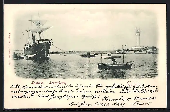 AK Trieste, Lanterna / Leuchtturm, Schiff und Boote am Hafen
