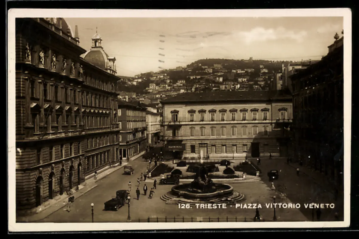 AK Trieste, Piazza Vittorio Veneto con fontana e edifici storici