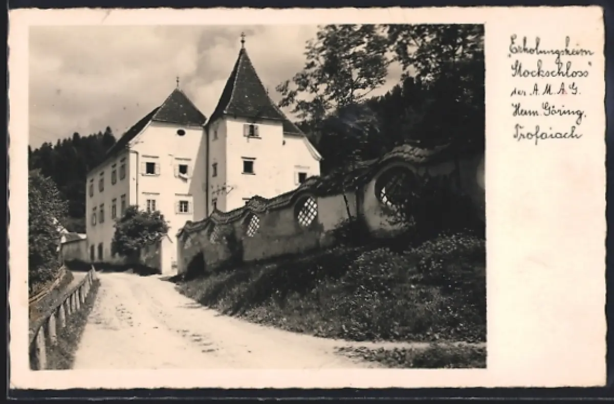 AK Trofaiach, Erholungsheim Stockschloss der A. M. A. G. Herm. Göring, mit Mauer und Strasse