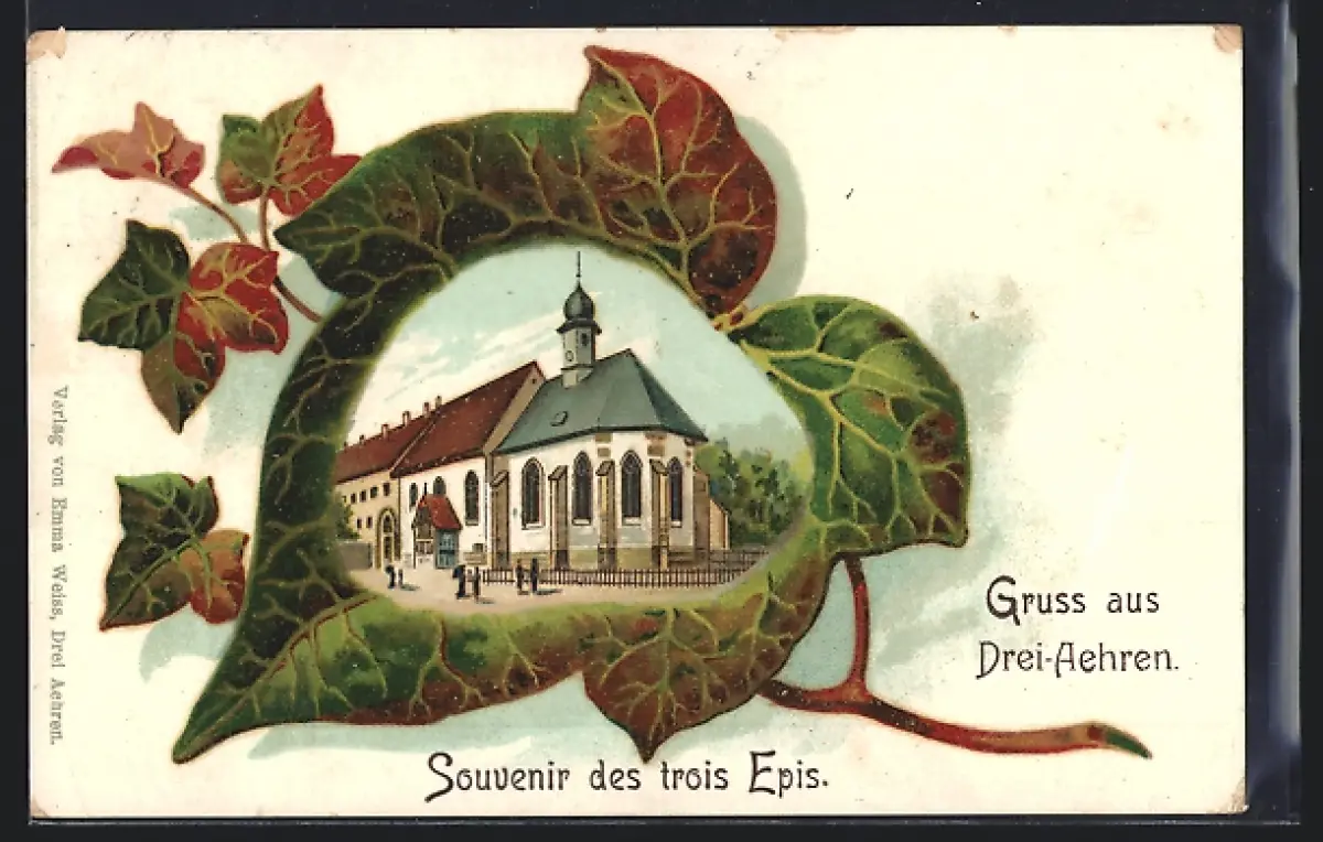 AK Trois Epis, Vue de l`église entourée de feuilles