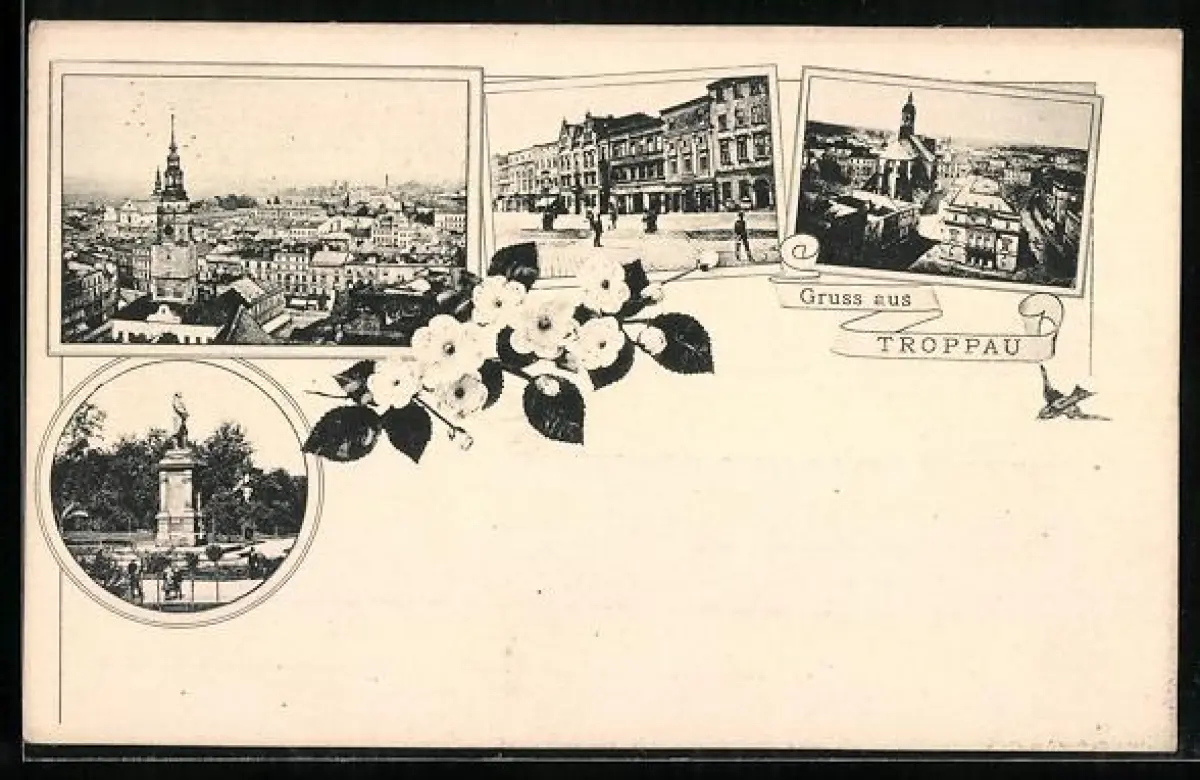AK Troppau, Partie am Markt, Blick auf den Ort