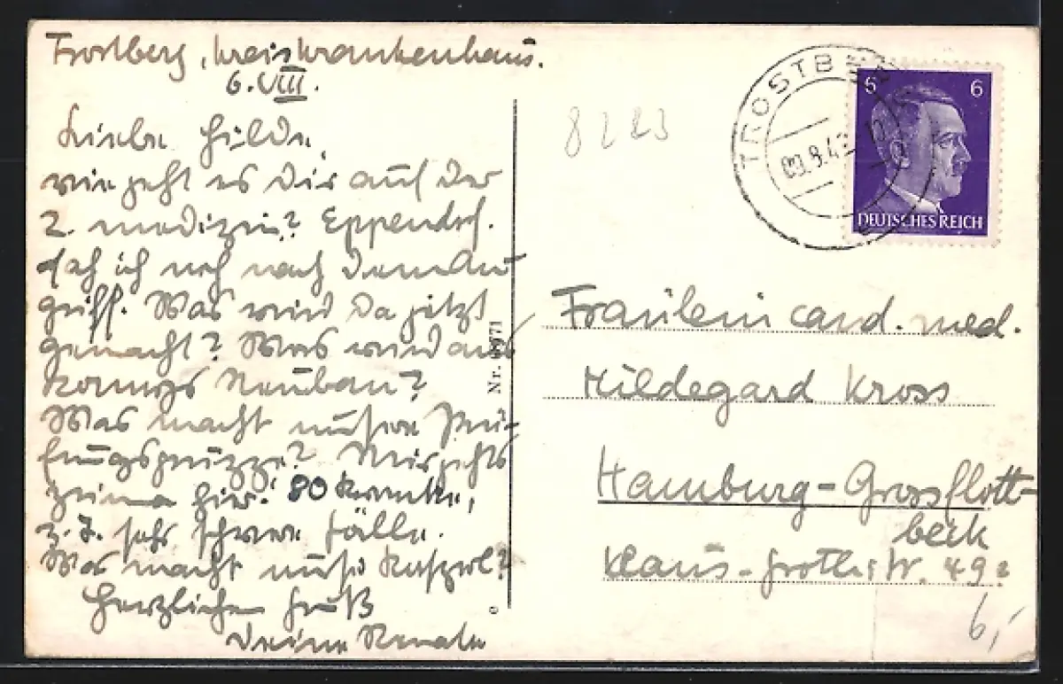 Personenbezogene Daten auf der Rückseite der Karte wurden durch blauen Textmarker unkenntlich gemacht. Die blauen Stellen sind auf die Vorderseite durchgeweicht und wirken sich negativ auf das Postkartenfoto aus